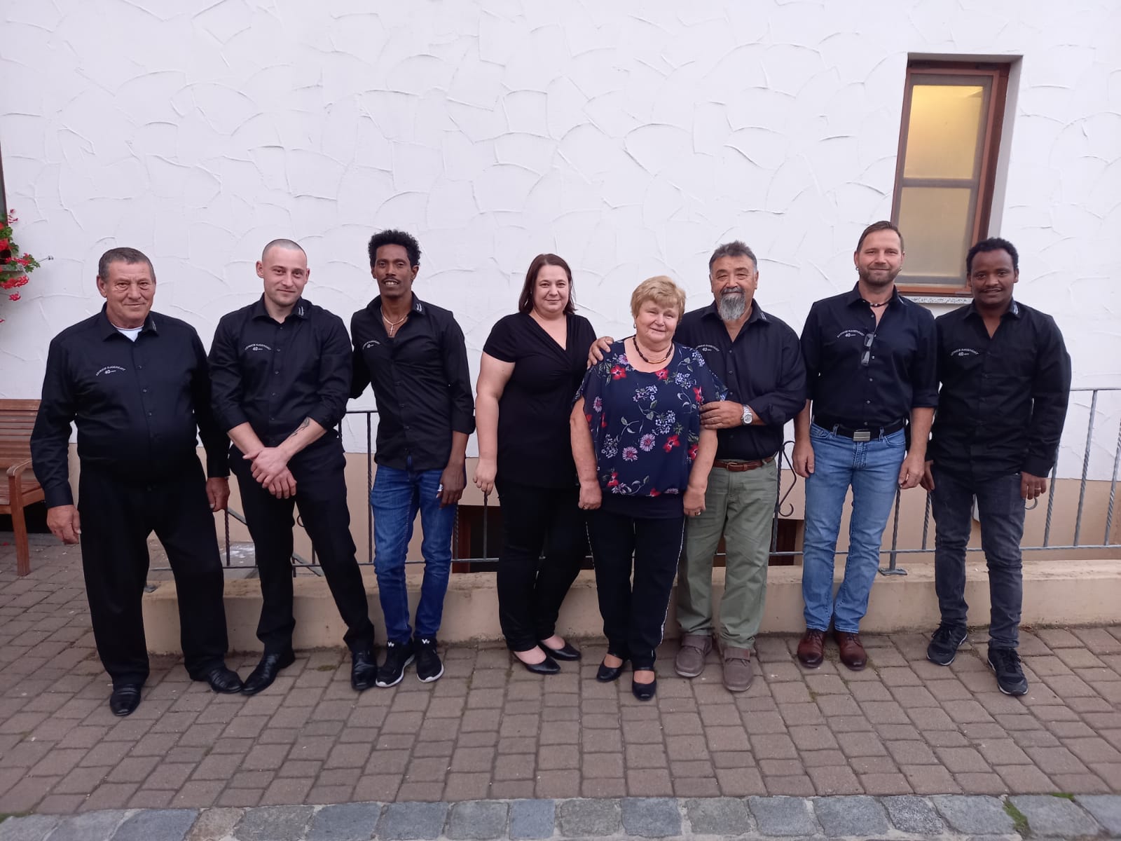 v.l.n.r.: Alexander Keller, Niko Keller, Habtom Kahsay, Sandra Kammerer, Seniorchefin Brigitte Nagengast, Seniorchef Norbert Nagengast, Geschäftsführer Harald Nagengast und Yonas Fshatsion